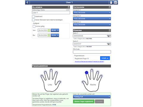 DIe Fingerabdrücke der Benutzer können über dieselbe Software registriert werden, indem Sie im Benutzerfenster auf die Registerkarte „Biometrie“ klicken. Je nach Lesertyp können Sie dem gleichen Nutzer eine RFID-Karte, eine Kartennummer oder einen PIN-Code zuordnen.