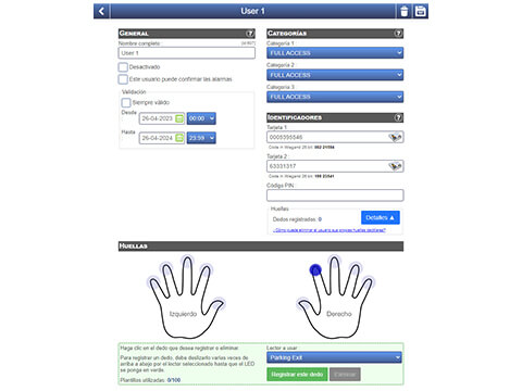 Desde la ventana principal, puede configurar el perfil de acceso de cualquier usuario, el registro, proporcionar tarjeta de acceso, registrar la huella digital, ver el horario y el acceso de grupos, gestionar su entrada al aparcamiento, bloquear el acceso a determinadas salas, etc.