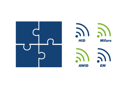 Reads Mifare Cards 13.56 MHz (Classic, Ultralight, Desfire), EM Proximity Cards 125 kHz, HID 125 kHz, AWID 125 kHz and NFC Compatible Cards.